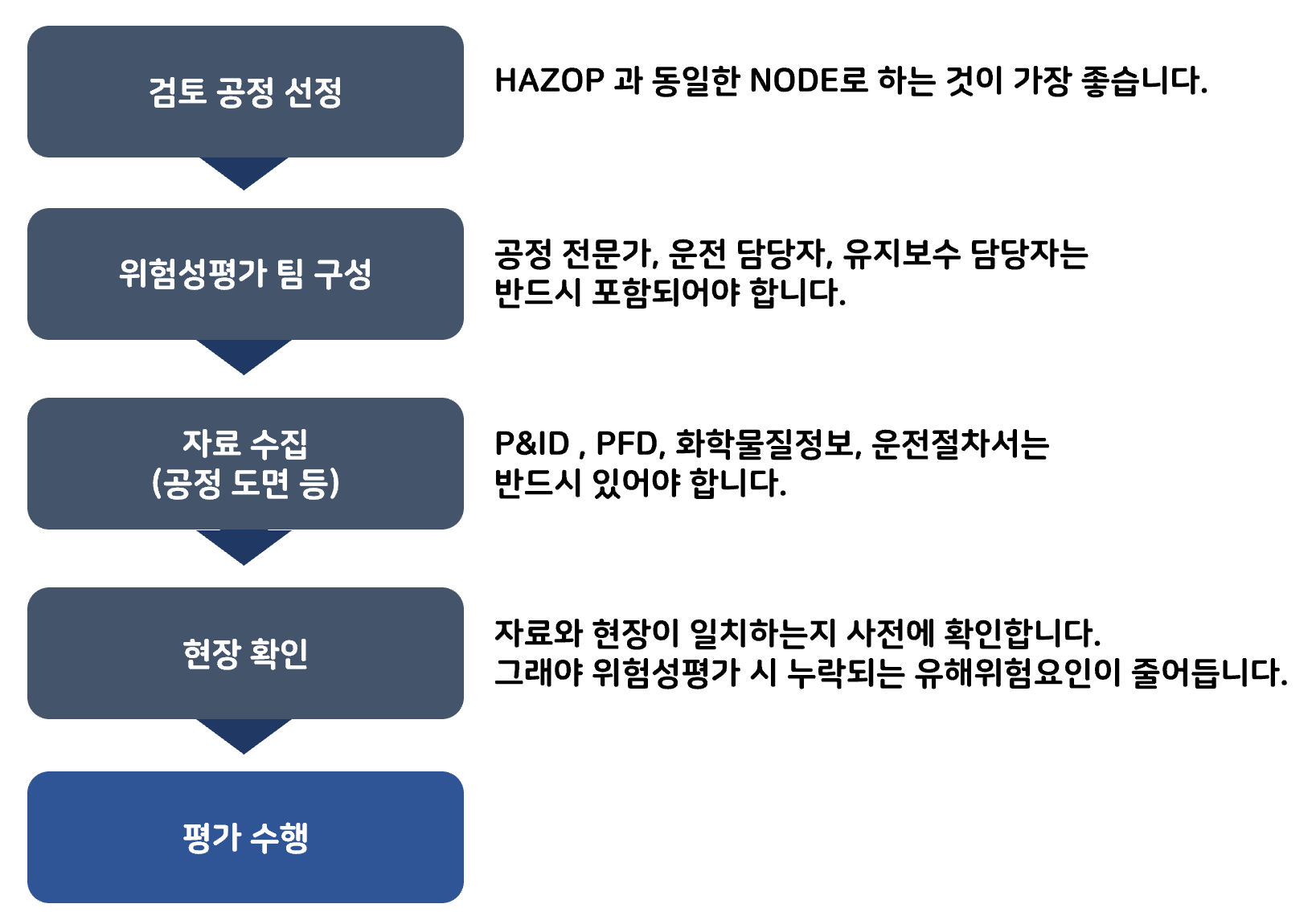 검토 공정 선정 → 위험성평가 팀 구성 → 자료 수집 (공정 date 등) → 현장 확인 → 평가 수행 → 보고서 작성 → 후속조치
