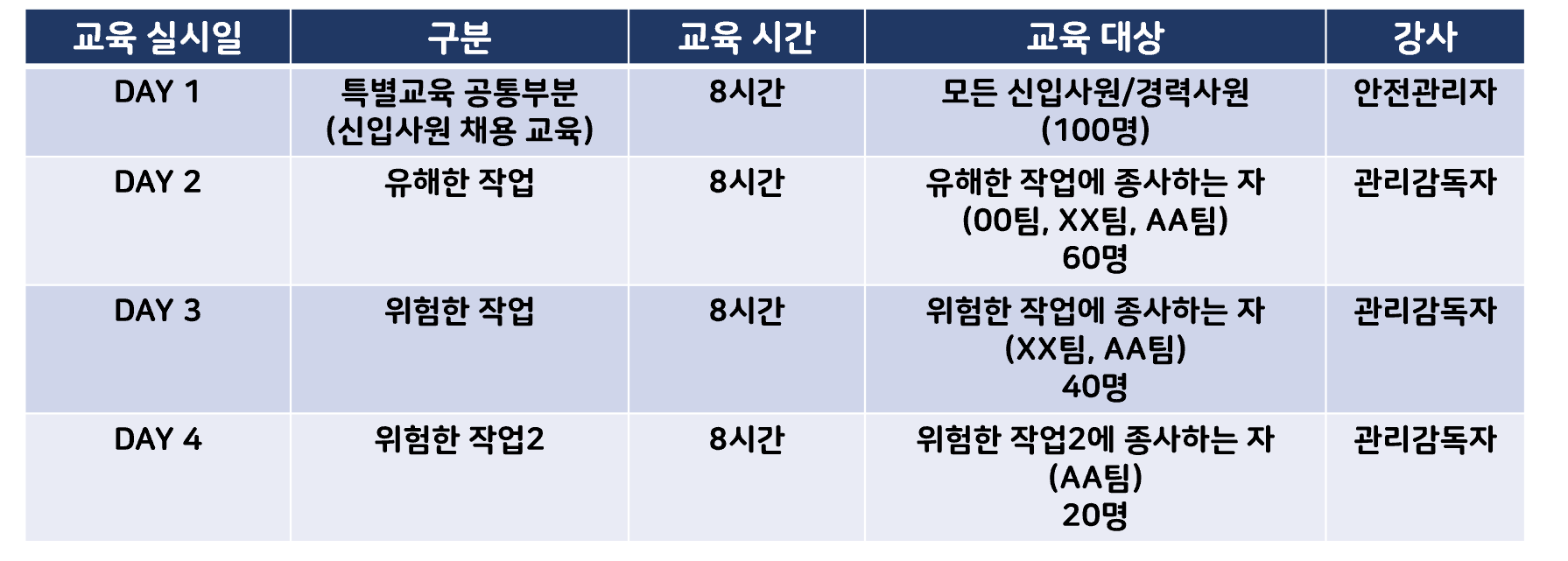 DAY 2 부터는 각각의 유해하거나 위험한 작업을 구분하여 교육을 실시합니다.