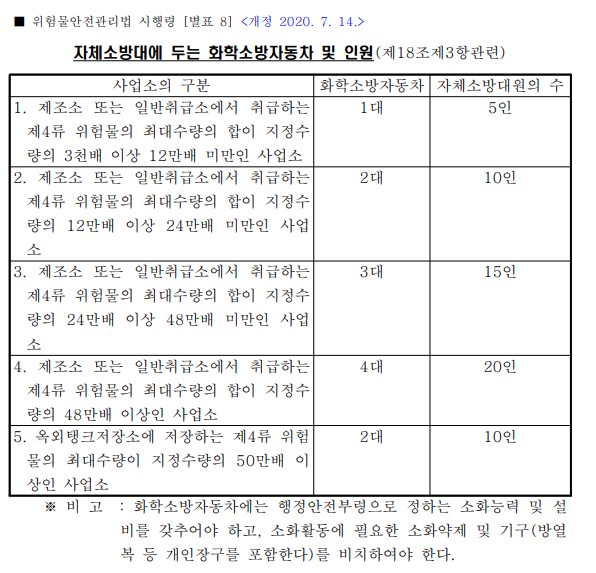 위험물안전관리법 시행령 별표8에 보면 아래와 같이 자체소방대에 두는 화학소방자동차 및 인원이 있다.