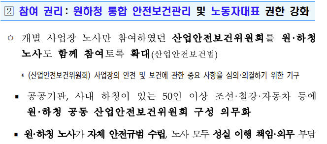 이와 관련하여 현행범을 보니 이미 하청 사측과 하청 노측도 원청의 산안위에 참여할 수 있는 여지를 두었으며, 이를 확대하여 지정되는 업종에 한해서는 반드시 원하청 산안위를 하도록 하는 것이 이번 노동정책의 핵심으로 보여집니다. (자동차, 철강, 조선 등)