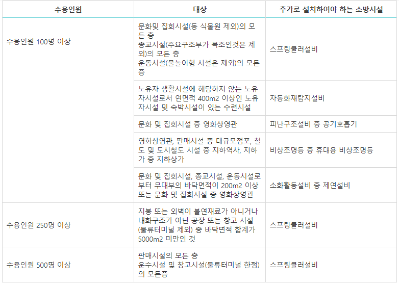 | 수용인원 250명 이상 | 지붕 또는 외벽이 불연재료가 아니거나 내화구조가 아닌 공장 또는 창고 시설(물류터미널 제외) 중 바닥면적 합계가 5000m2 미만인 것 | 스프링쿨러설비 |